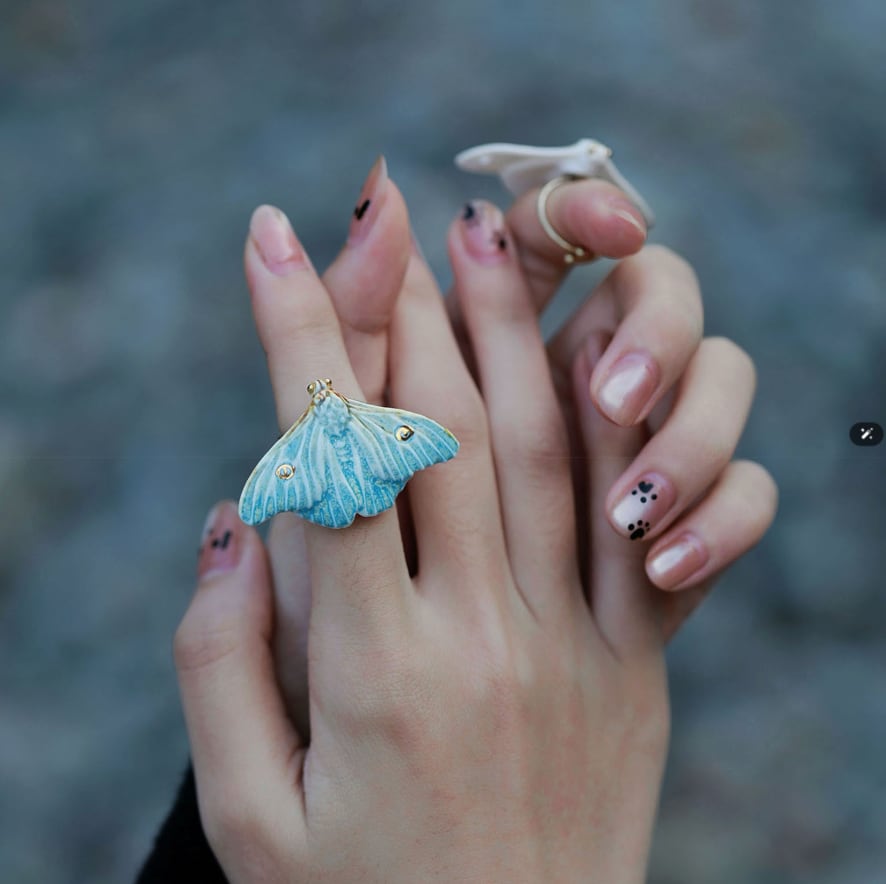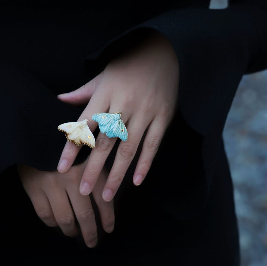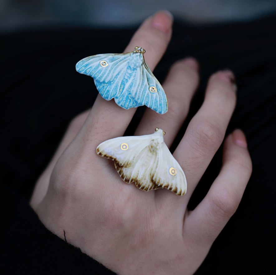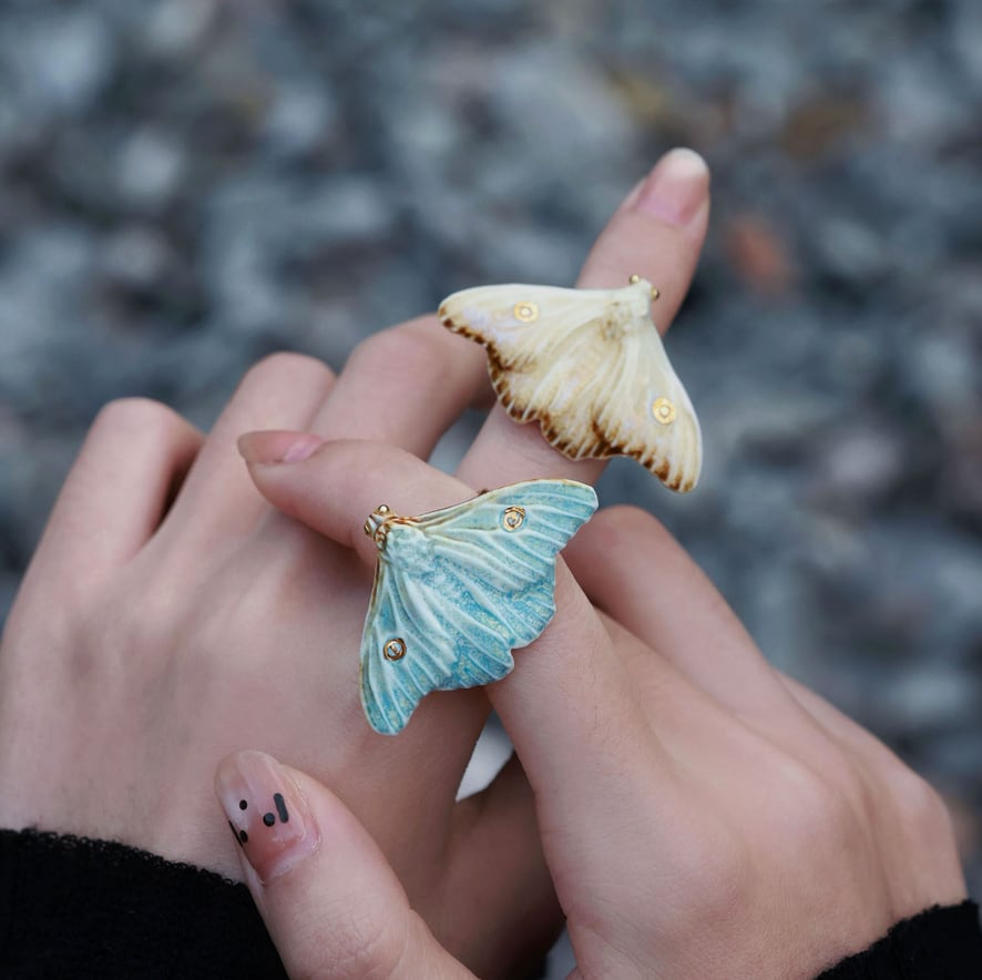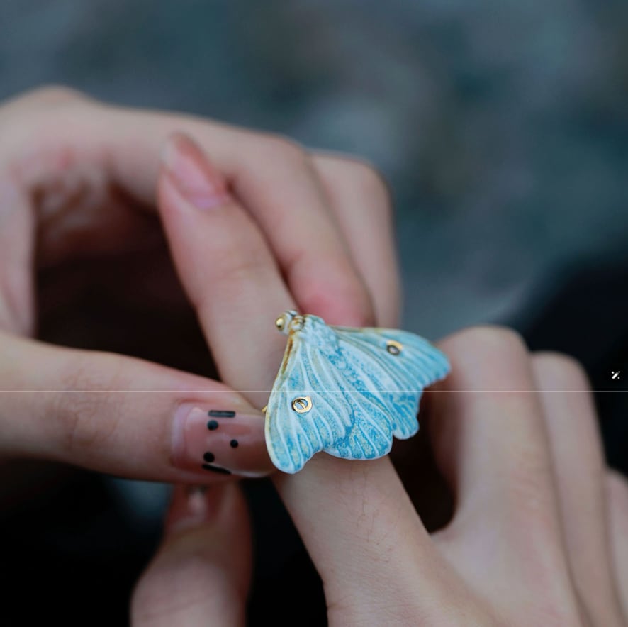 陶器の翅に金の星環がきらめき、蒼月の夜をそのまま閉じ込めたような高級感。