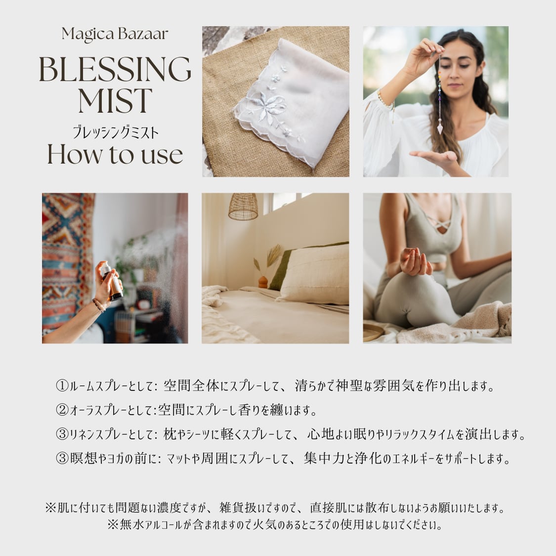 ③瞑想やヨガの前に: マットや周囲にスプレーして、集中力と浄化のエネルギーをサポートします。