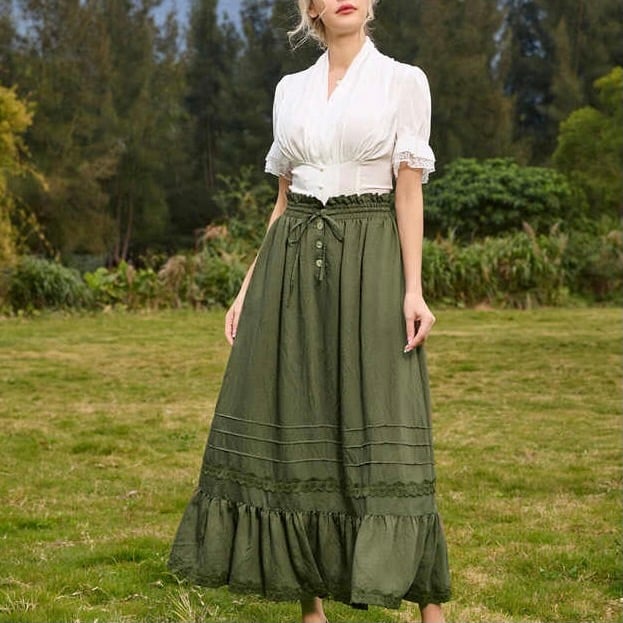袖と裾にはフリルをあしらい、女性らしい雰囲気も加わっています。